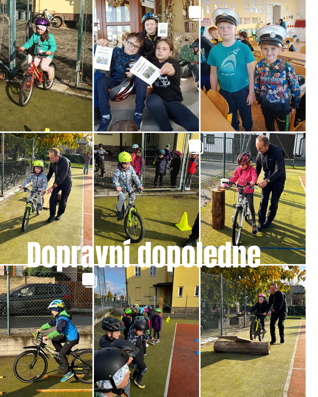 V pondělí 13. října proběhlo v naší škole Dopravní dopoledne ve spolupráci s policií ČR. Děti byly rozděleny na dvě poloviny, kde každá absolvovala teoretickou část a praktickou část. S teorií bezpečného chování na komunikacích seznámili naše žáky policejní zástupci, nprap. Daniel Včelka a prap. Lukáš Spáčil. Zaměřili se především na bezpečnost cyklistů a jezdců na koloběžkách. Zdůraznili nutnost nosit přilby, jaké následky a úrazy mohou nastat, když je někdo nemá. Upozornili na nejčastější důvody kolizí aut a dětí. Také připomněli pravidla při přecházení silnice. Největším zážitkem bylo testování na užití návykových látek, nošení pout, či vyzkoušení si policejní čepice nebo obušku. Praktickou část děti absolvovaly na zdejším hřišti, kde byla připravena jízda zručnosti. Každý s malou nervozitou očekával, jestli trať zvládne projet. Ale po několika kolech a neustálém zlepšování, všichni jízdu zručnosti zvládli. Za odměnu byl dětem předán průkaz cyklisty.