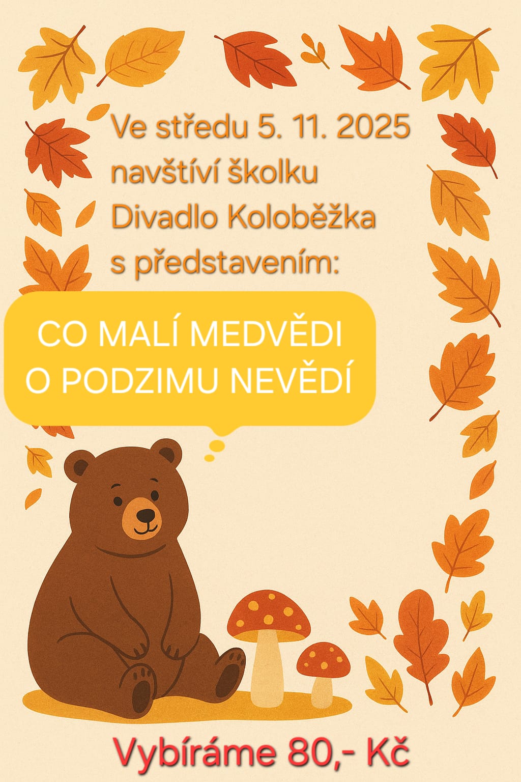 Do školky přijede Divadlo Koloběžka! Těšíme se na veselé představení "Co malí medvědi o podzimu nevědí", které nás zavede do barevného světa podzimu.