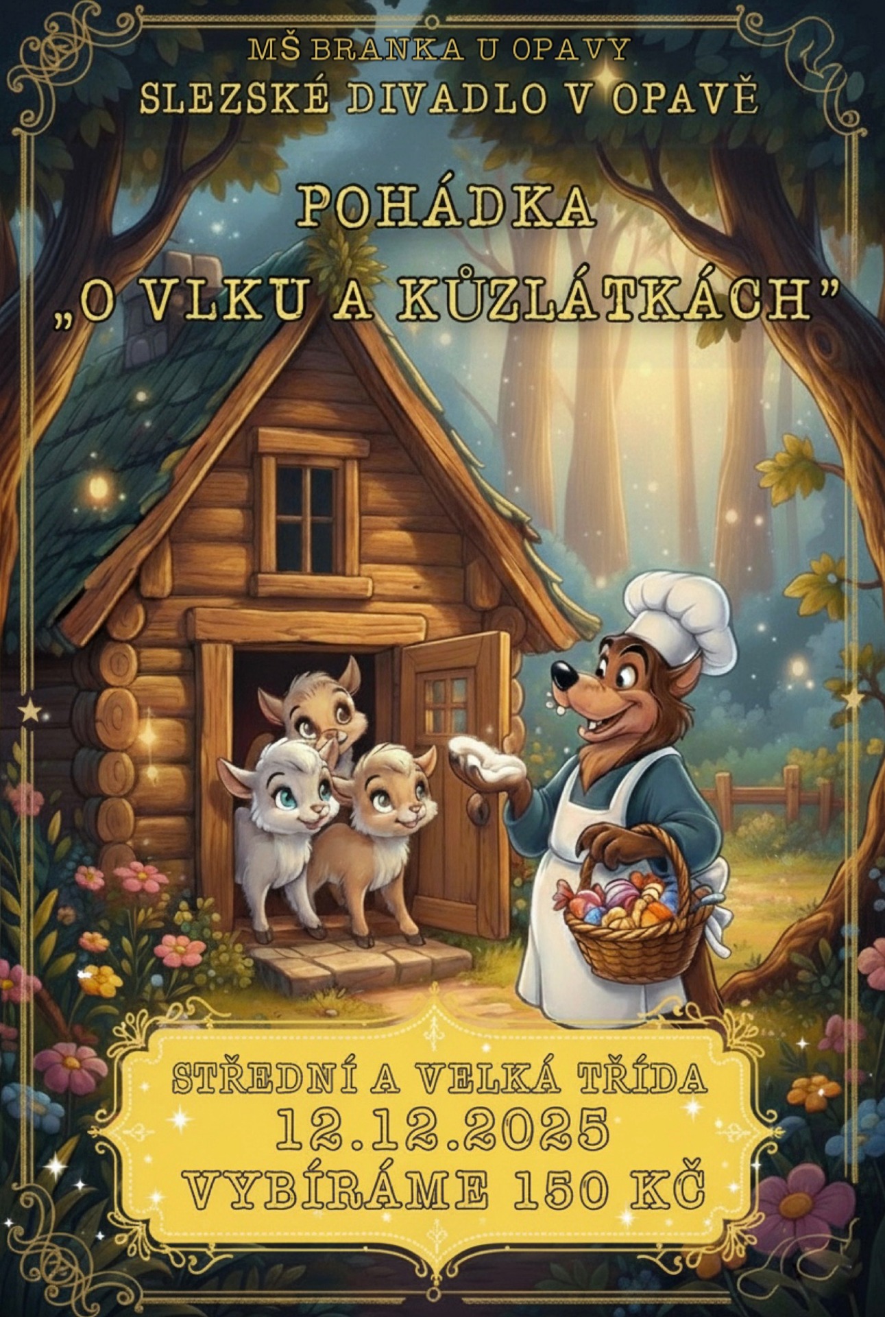 V pátek 12.12. jede střední a velká třída do Slezského divadla na pohádku O vlku a kůzlátkách. Prosíme, aby měly děti vhodné oblečení. Těšíme se na krásný společný zážitek!