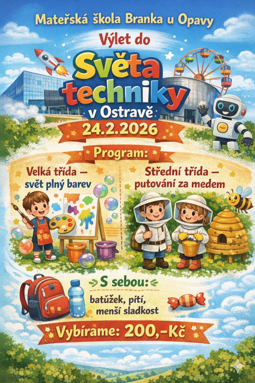 Dne 24. 2. pojede velká a střední třída na vzdělávací výlet do Velkého světa techniky. Programy: Velká třída: Svět plný barev -- Střední třída: Putování za medem. Cena výletu: 200 Kč.